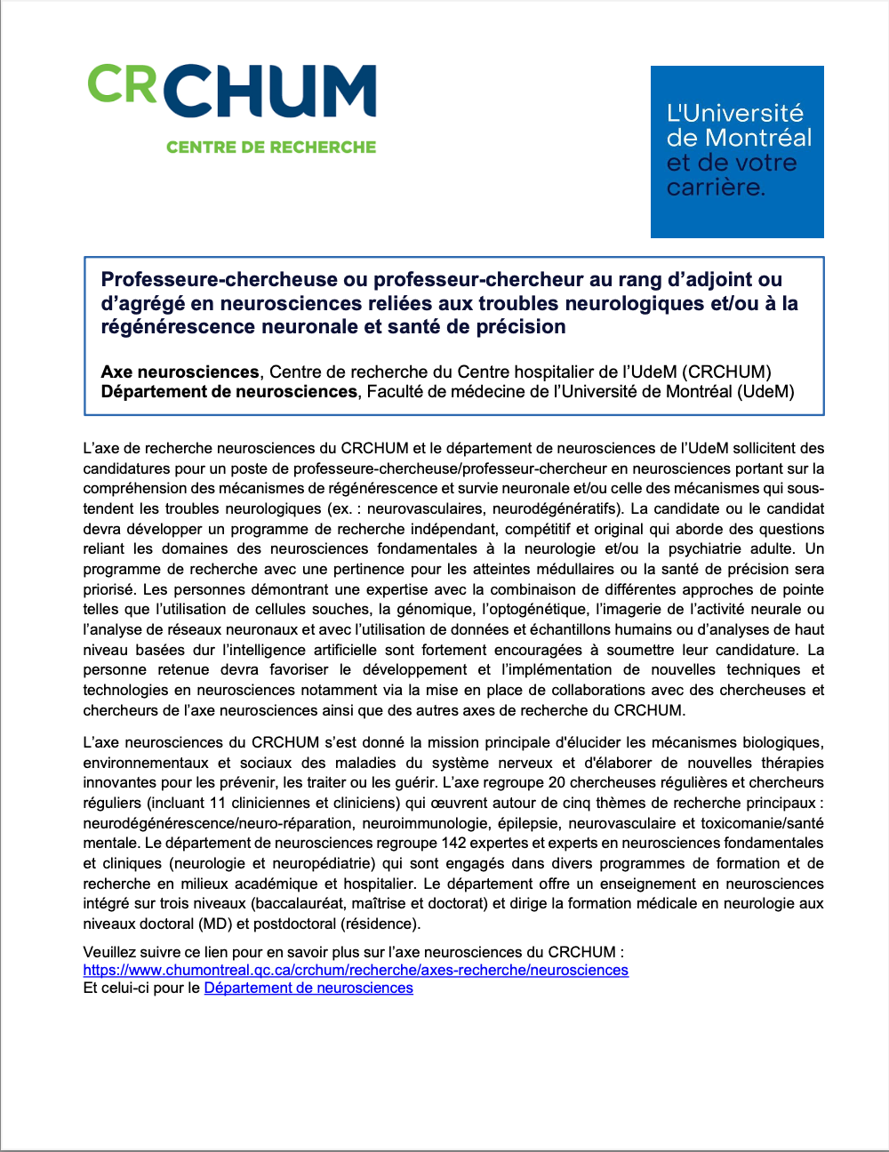 Accueil / Non classé / Professeure-chercheuse ou professeur-chercheur au rang d’adjoint ou d’agrégé en neurosciences reliées à la régénérescence neuronale, aux cellules souches et aux pathologies associées à la moelle épinière / affichage_FR_1