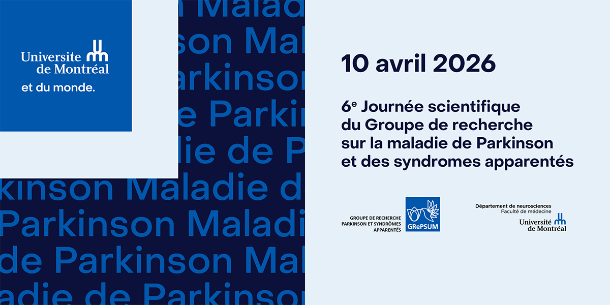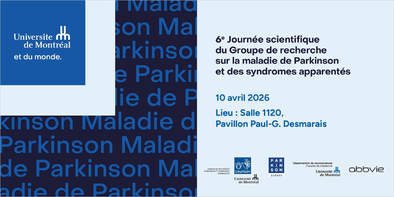 La 6e Journée Parkinson du GRePSUM (Groupe de Recherche Parkinson et Syndromes Apparentés de l’Université de Montréal) aura lieu au pavillon Paul-G.-Desmarais. Près d’une centaine de chercheurs et chercheuses, étudiants et étudiantes aux cycles supérieurs et praticiens et praticiennes du domaine se réuniront afin de partager les efforts en cours dans les différents milieux et laboratoires de l’Université de Montréal et centres de recherche affiliés. Une série de présentations orales donneront un tour d’horizon de la recherche actuelle dans ce domaine dans la grande famille de l’Université de Montréal. Les étudiants et stagiaires postdoctoraux sont particulièrement invités à présenter leurs travaux à l’aide de présentations orales.